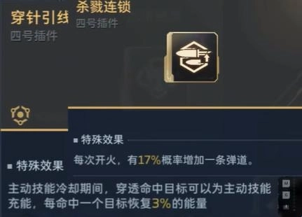 3、三号插件可搭配穿针引线或杀戮连锁:穿针引线能进一步缩短极速狂热的恢复时间,让技能循环更为流畅;杀戮连锁侧重极致的单体伤害,但实际测试后发现其整体收益不及穿针引线,因此个人更推荐选择穿针引线。
