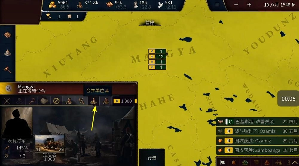 4、找到左下角的菜单,点击其中的【合并】按钮,就能把多支军队合并成一支。