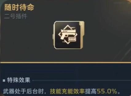 4、副武器选择震弦,能进一步增加暴击率与暴击伤害,副武器插件方面,最关键的是“随时待命”,它可以提升技能的充能速度;