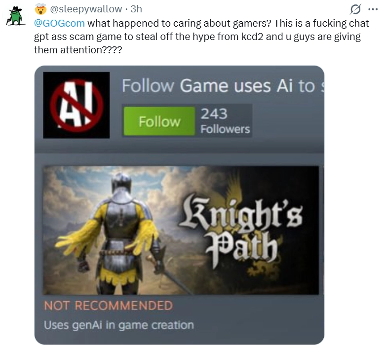 最近有一款名为《骑士之路》的独立游戏在海外引发热议,事情的开端是该游戏开发团队公开反对DEI相关要求,之后遭到某组织常用的“取消文化”抵制手段。抵制未达目的后,他们又被污蔑游戏内容由AI生成。然而这些操作反而让《骑士之路》的热度更高了,其官方发布的一段普通实机演示视频,在YouTube平台上的播放量就突破了34万次。