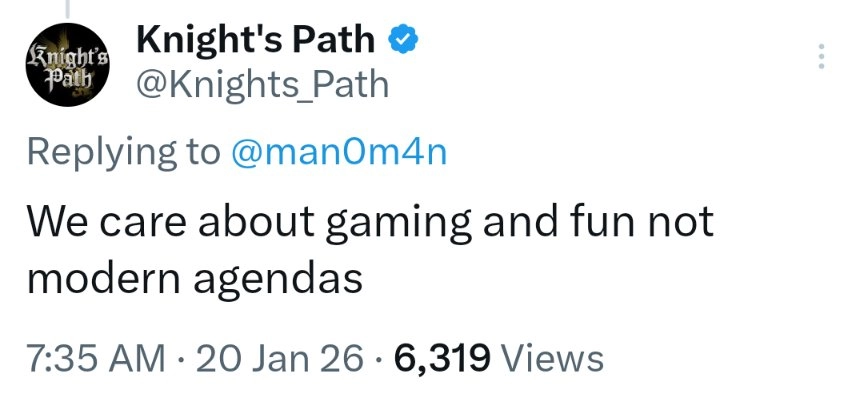 某组织要求在《骑士之路》中加入特定元素,游戏官推的回应思路十分直接,恐怕会让该组织感到不满:我们关注的核心始终是游戏本身以及玩家的游玩体验,而非迎合当下的某些议题。
