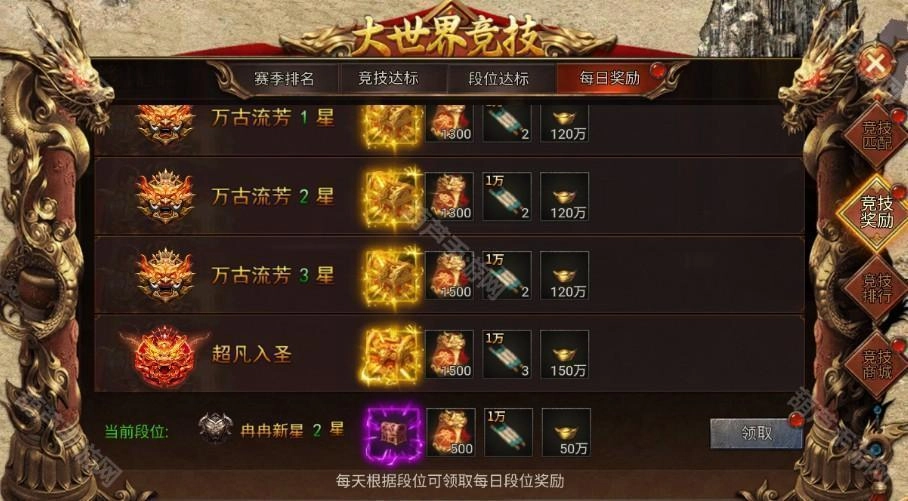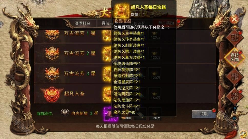 根据当日段位领取奖励(段位越高,每日宝箱内的道具奖励品质越优,可获得的大世界竞技令数量也越多)