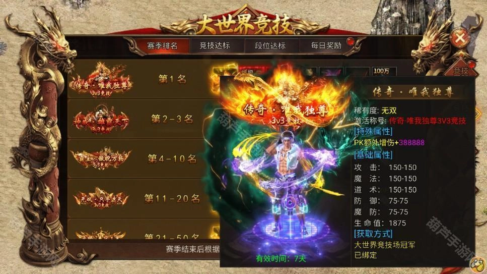在赛季结算时位居排名榜首的玩家,将能获取无双称号——传奇·唯我独尊3V3竞技,该称号还会附带额外的PK增伤效果。