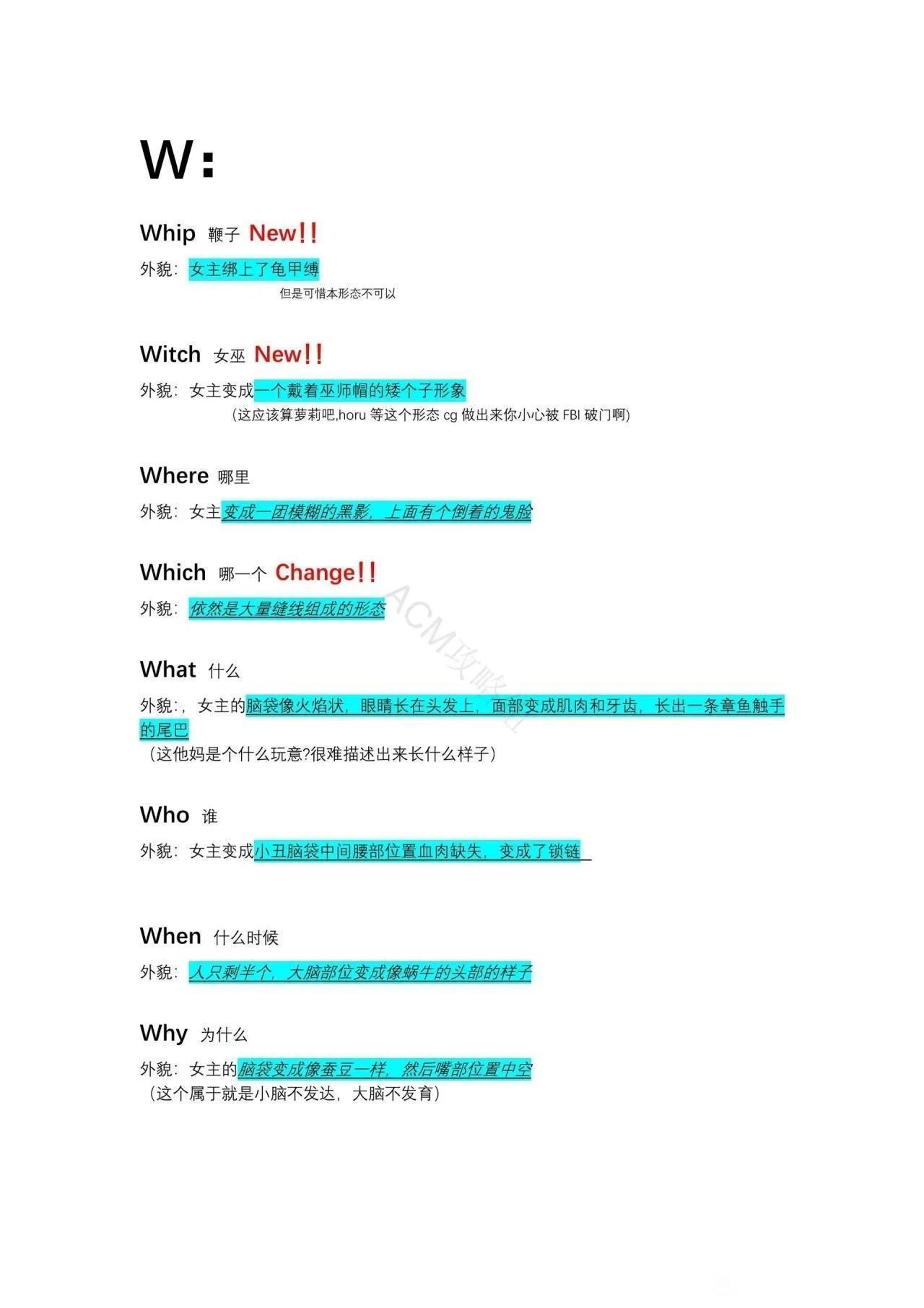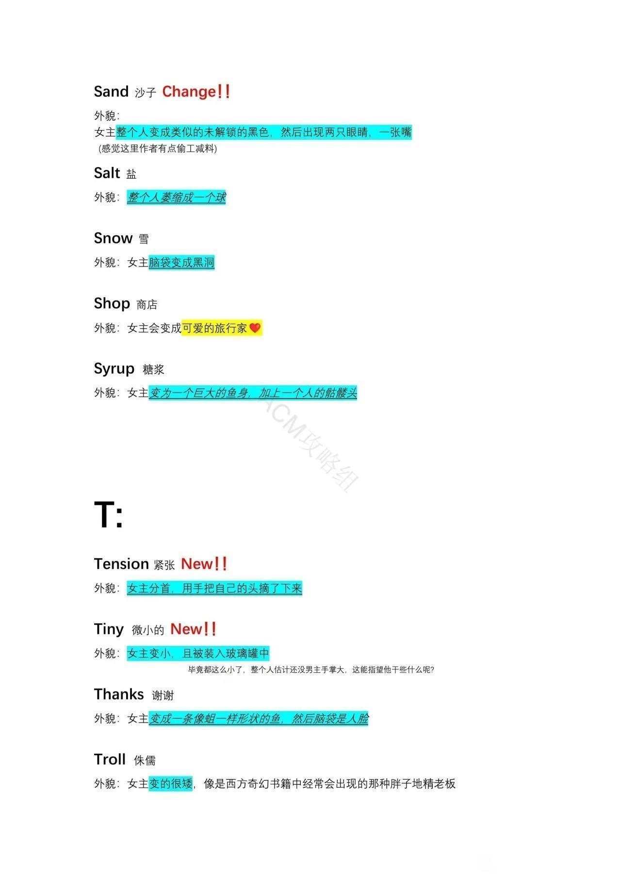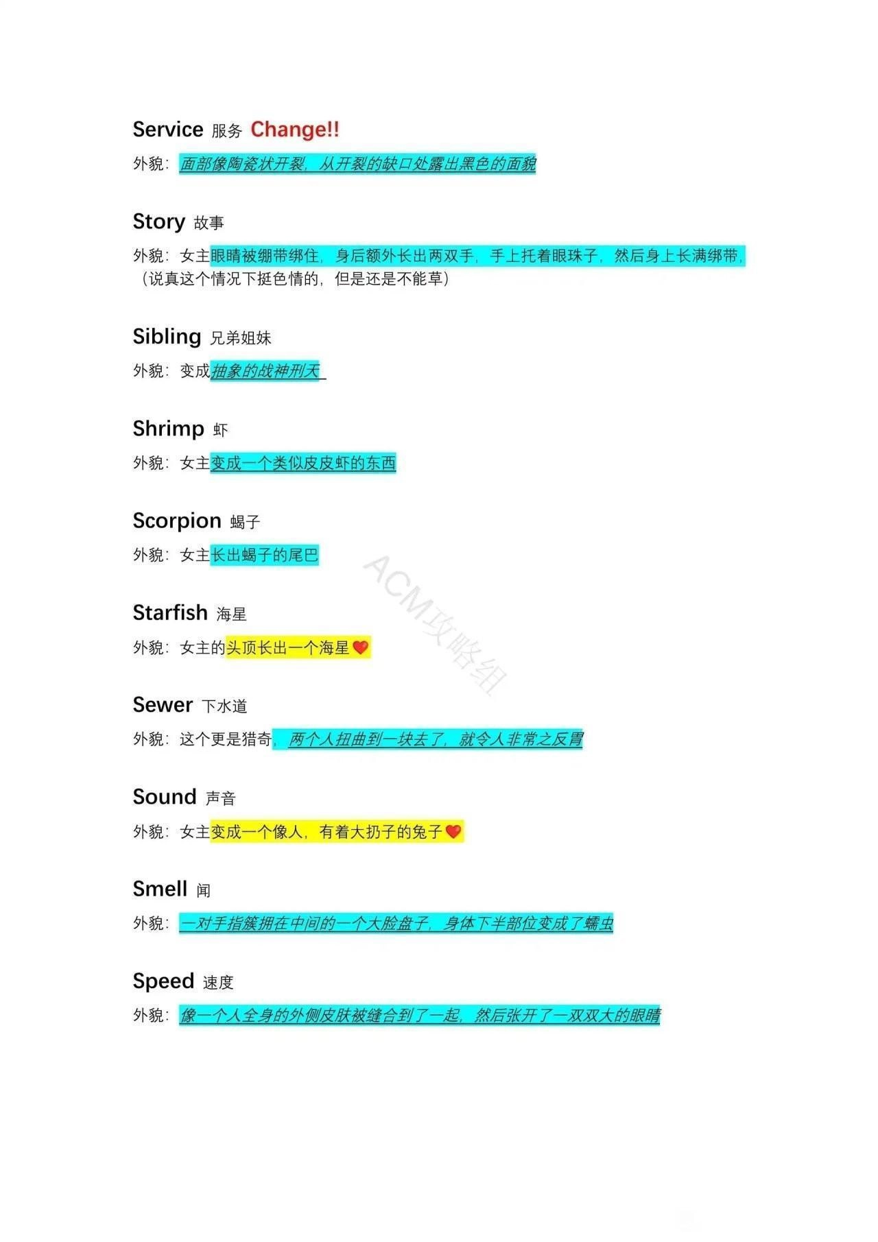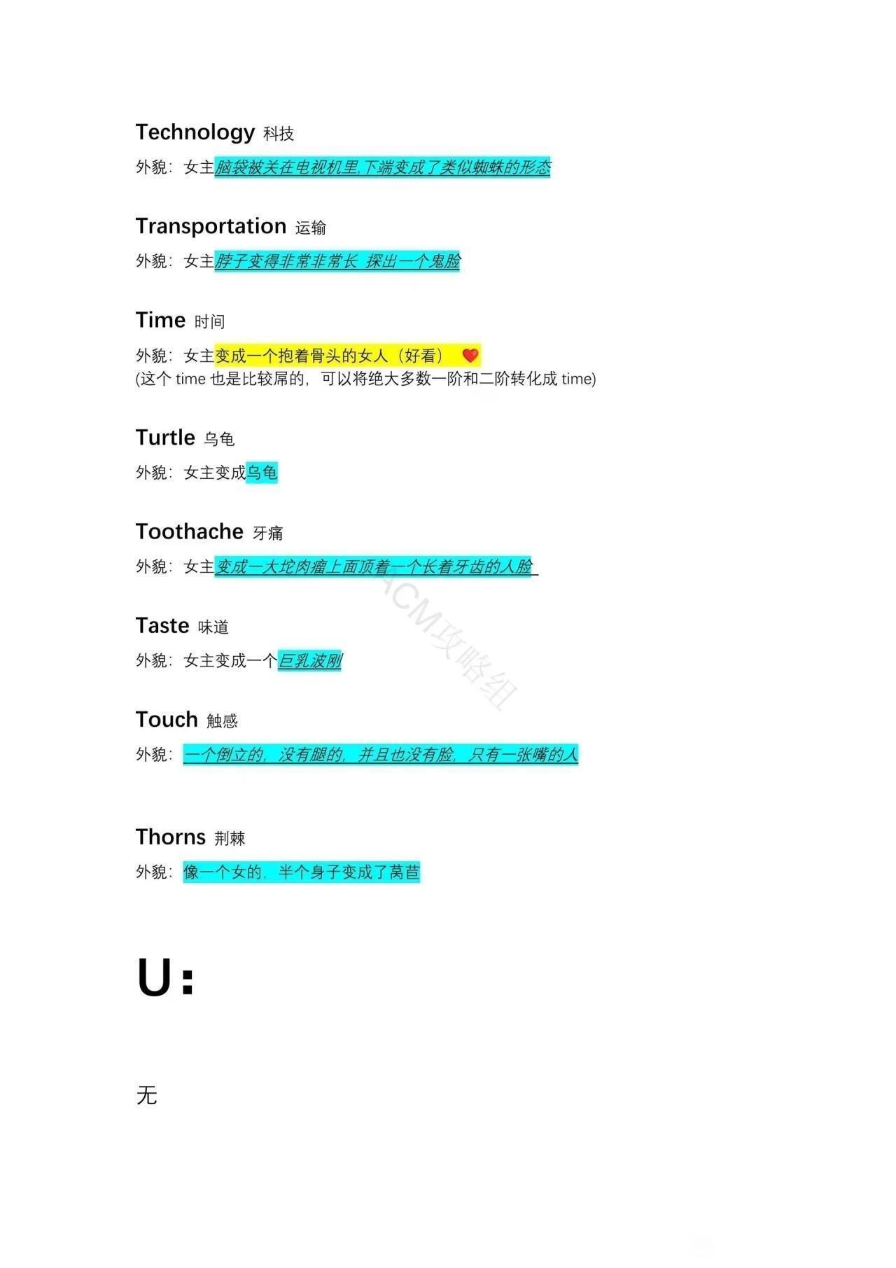 外貌:女主变成一大坨肉瘤上面顶着一个长着牙齿的人脸。