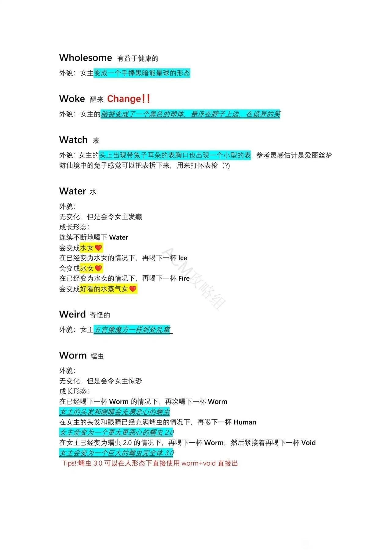 (1)在已经喝下一杯 Worm 的情况下,再次喝下一杯 Worm女主的头发和眼睛会充满恶心的蠕虫。