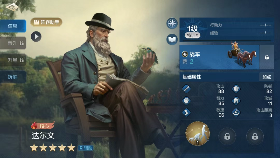 达尔文的兵种配置包含骑兵,其初始属性在核心梯队里只能说是表现平平,唯独敏捷属性达到了96点,这一数值和理查一世一致。考虑到他辅助型的定位,这样的敏捷属性完全能够满足需求。