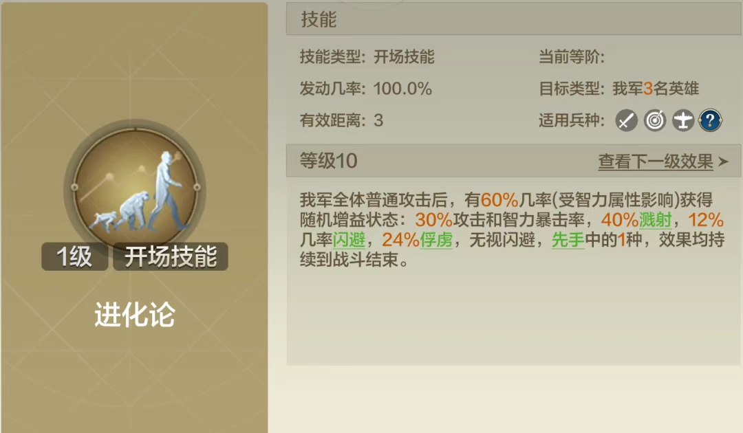 达尔文的自带技能属于开场技能,在我军全体完成普通攻击后,有一定概率为他们附加随机增益效果,而且这些增益能一直持续到战斗结束。