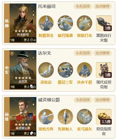 由于骑兵无法享受增益效果,所以优先考虑非骑兵的追击型英雄托米丽司或伊莎贝拉一世。这里选用托米丽司作为统帅,达尔文中军,威灵顿公爵前锋。达尔文的自带技能需要普攻后才有可能获得霸体,因此这队组合比较害怕缴械状态,但一旦展开输出,伤害量是相当可观的。