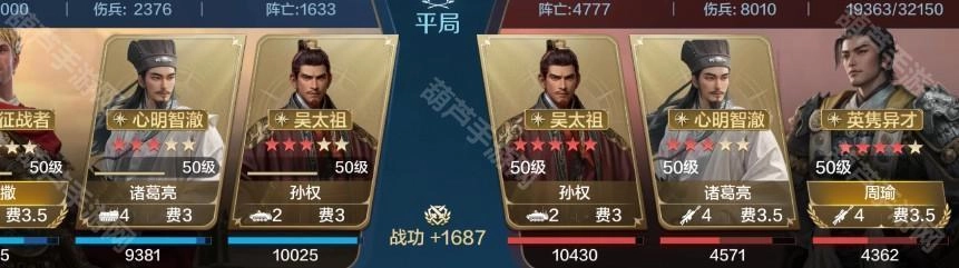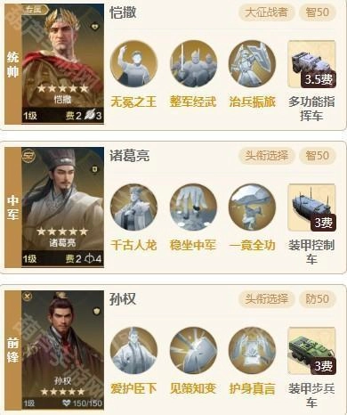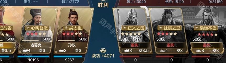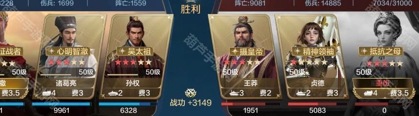 诸葛亮通过降低敌方智力,为队伍创造打出高额输出的条件,同时他携带的治疗技能还能进一步抬升队伍整体血量;恺撒则以稳定的治疗能力配合“治兵振旅”战法补充输出;孙权凭借其机制保障队伍下限,让队伍能够轻松应对部分追击型队伍。