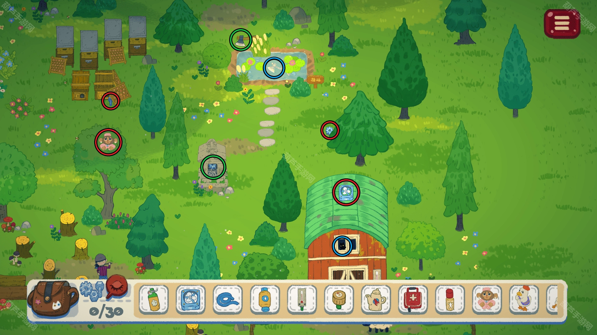 ①红圈标识的内容包括:部件、硬币、星星以及道具清单