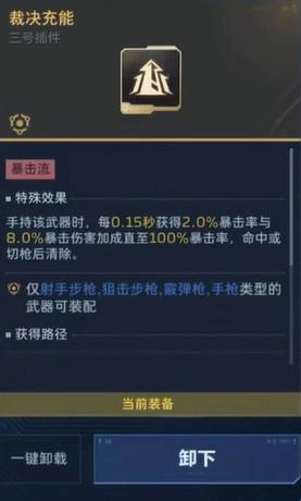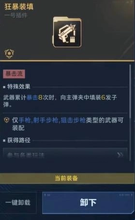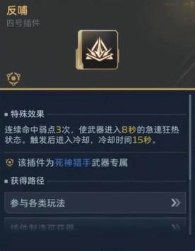 一号插件装备【狂暴装填】,二号插件选用【暴击涌流】,三号插件搭配【裁决充能】,四号插件则使用死神专属的【反哺】插件。