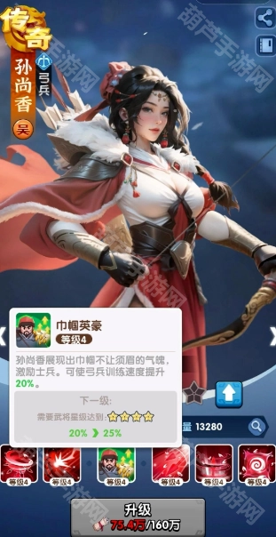 3、觉醒后的孙尚香,其全局被动技能并未得到属性上的提升,仅新增了弓兵训练速度的加成效果,这个被动技能偏向功能性;值得一提的是,她作为平民玩家可通过乾坤寻将免费获取并达成满星、觉醒满星的武将,对平民相当友好。若吴国阵营的玩家二代周瑜尚未满星,可暂时用觉醒孙尚香来过渡使用。