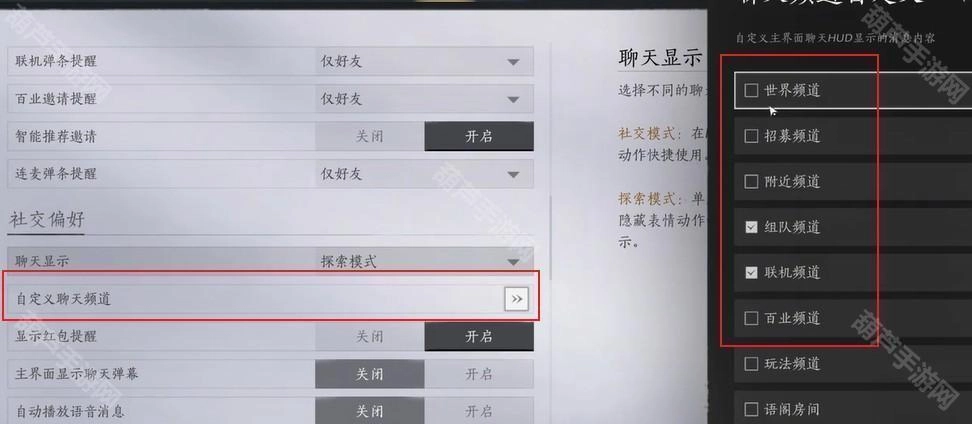 3、点击“自定义聊天频道”,把所有勾选的选项都取消掉