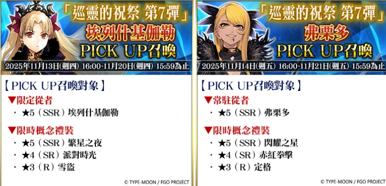 2025年11月11日(星期二)16:00至11月21日(星期五)15:59期间开启的「巡灵的祝祭第7弹」PICKUP召唤,将推出涵盖4骑从者的4个召唤卡池,其中包括限定从者「★5(SSR)阿尔托莉亚·潘德拉刚〔Alter〕〔Rider〕」「★5(SSR)伊丝塔〔Archer〕」「★5(SSR)埃列什基伽勒」,以及常驻从者「★5(SSR)弗栗多」。值得注意的是,每个卡池里都收录了「巡灵的祝祭第7弹」对应从者初次登场时活动的限时概念礼装。