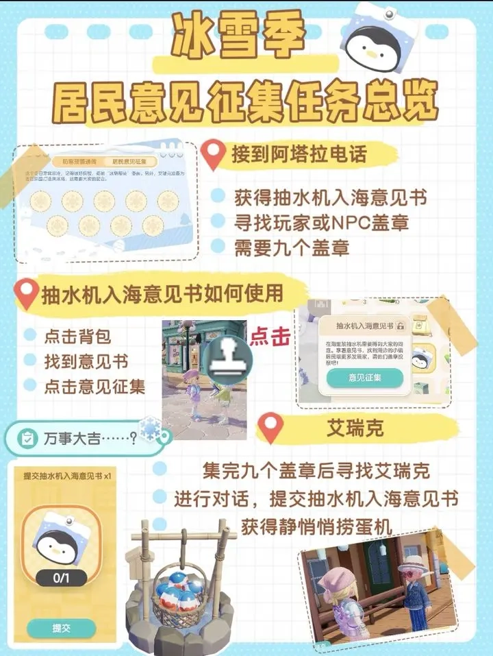 心动小镇冰雪季限时活动“抽水机入海意见书”任务现已开启,玩家需集齐九位NPC的盖章方可推进计划。该任务覆盖小镇全域,需与多位居民互动并完成他们的专属委托。本文将为你提供完整的盖章收集流程及实用技巧。