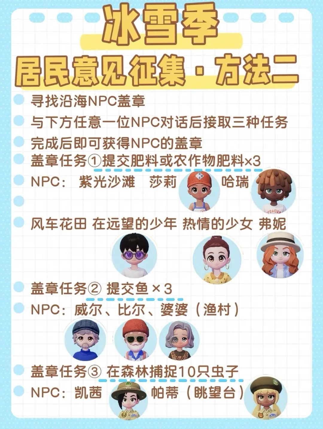 本次限时活动的截止时间为2月10日。在顺利完成全部任务并提交意见书后,您将能够领取一套限定的雪景主题家具套装作为奖励。为了防止因错过关键角色而致使收集进度滞后,建议您优先处理每日更新的NPC委托任务。