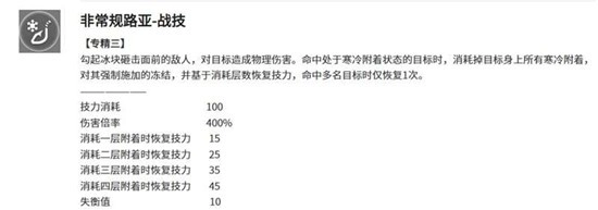 这是阿列什在明日方舟终末地中的核心技能。释放战技时会投掷冰块造成伤害,其关键机制在于,当命中带有寒冷附着效果的目标时,会消耗该目标身上的寒冷层数并强制将其冻结,同时根据消耗的层数回复大量技力。寒冷层数越高,技力回复量就越多,在理想状态下,这种回复能大幅抵消技能自身的技力消耗,从而实现近乎无间断的技能循环。