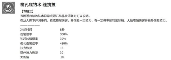 该技能会在附近目标的异常状态被消耗时触发。它的基础伤害与技力回复效果较为稳定,还有一定概率触发“珍鳞”效果,从而进一步提高伤害与技力回复量。尽管存在随机性,但要是和能频繁消耗异常状态的队友搭配,这个技能的触发频率和整体收益就会变得相当可观。