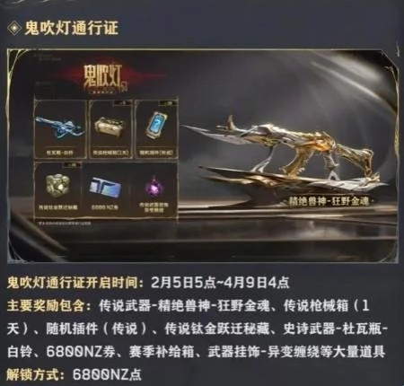 赛季更新当天,鬼吹灯赛季的通行证就会同步上线。这款通行证和S0赛季通行证类似,等级上限约为30级,玩家达到对应等级后,就能获取精绝兽神的皮肤。值得注意的是,S0赛季通行证并不会下架,届时将出现双通行证同时存在的情况。