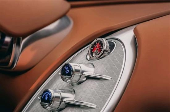 座舱内部的中控台采用一整块铝合金精密加工而成,车内织物由法国巴黎的一家工坊手工织造,并且搭配了一枚直径43毫米的爱彼皇家橡树系列陀飞轮腕表。