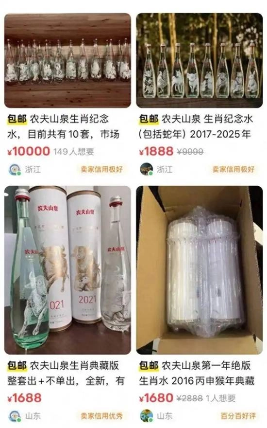 二手交易平台信息显示,农夫山泉2016年的“金猴水”、2017年的“金鸡水”套装,部分卖家标价已达上千元。卖家解释称,“早年收藏生肖水的人不多,特别是前两年的款式格外稀缺;而且生肖水每年限量推出10到20万套后就会停产,之后再想找到同款,难度就大了。”针对这一现象,农夫山泉方面向九派新闻记者回应:生肖典藏玻璃瓶水的水源来自长白山莫涯泉,瓶身设计耗时三年;该产品推出十一年来,始终坚持“只送不卖”的原则。其定位主要是感恩回馈消费者,作为品牌与消费者之间沟通的桥梁,传递文化内涵与美好祝福。