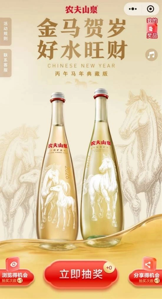 关于这款生肖水的获取途径,农夫山泉方面称,全国消费者都能通过农夫山泉官方线上渠道进行获取,比如农夫山泉品牌馆小程序里的满赠活动,还有农夫山泉送水到府+小程序、农夫山泉生肖水小程序中的线上抽奖形式等。行业内人士表示,最近几年,生肖类、限定款、纪念版的食品饮料经常在二手交易平台出现,它们的价格通常是由情绪价值、时间跨度以及“整套完整性”这几个因素共同作用推动的。从实际的成交状况来看,这类商品一般有着挂牌价高、成交不确定的特点,价格受市场情绪的影响比较大。