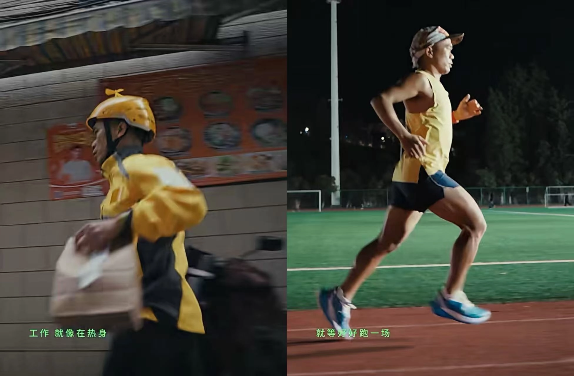 短片中,外卖员没有骑电动车,而是提着餐食在大街小巷奔跑。临近傍晚下班时,他特意选了一单送往体育场的订单。抵达体育场后,他脱下工装,换上安德玛的跑鞋,继续在空旷的跑道上奔跑起来……