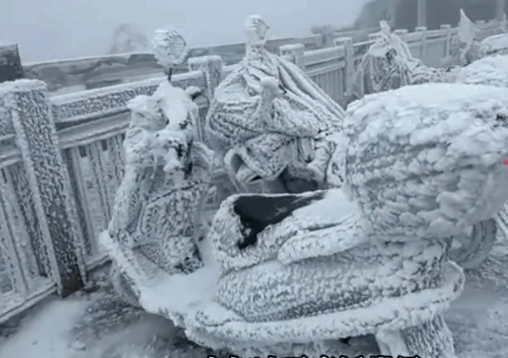 近日,受持续严寒天气影响,衡山出现大面积冰冻,呈现出独特的“冰河世纪”景观。放眼望去,栏杆、车辆等都被冰层覆盖,甚至有游客在登山途中被冻得发丝结冰。