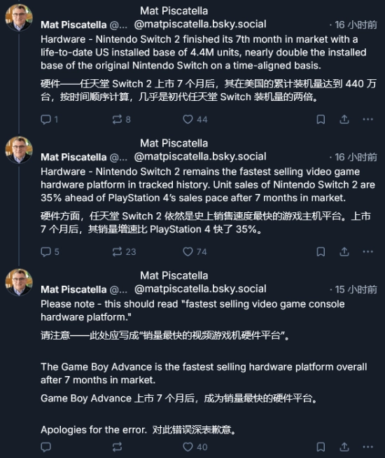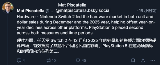 Circana分析师Mat Piscatella表示,Switch 2在2025年12月及整个年度期间,在美国市场的游戏硬件品类中,无论是销量还是销售额都位居榜首。这一表现也让Switch 2“保持了有史以来销售速度最快的游戏主机平台”这一纪录,毕竟没有其他主机能在上市最初7个月里,在美国市场实现440万台的销量(需要说明的是:GBA曾有过相近的成绩,但GBA在定位上比Switch 2更偏向掌机)。