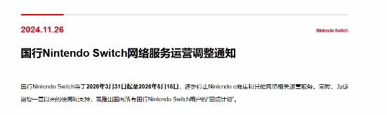 2024年腾讯官方就已发布公告,明确国行Nintendo Switch的Nintendo e商店及其他网络相关服务,将从2026年3月31日起至2026年5月15日期间逐步关停。待服务关停后,国行Switch将无法再购买或下载游戏,游戏的网络联机功能也将无法使用。