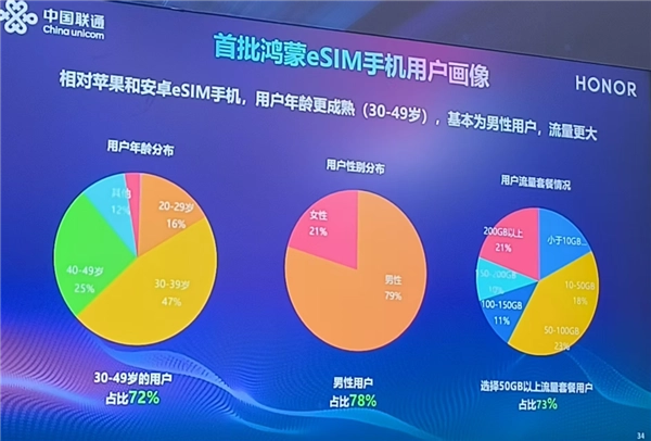 在首批使用eSIM功能的手机用户中,不同操作系统的用户在流量套餐选择上呈现出一定差异:鸿蒙系统用户里,选择50GB及以上流量套餐的占比达到73%;安卓系统用户中,选择80GB及以上流量套餐的占比为50%;苹果系统用户里,这一(80GB及以上流量套餐)占比则是43%。