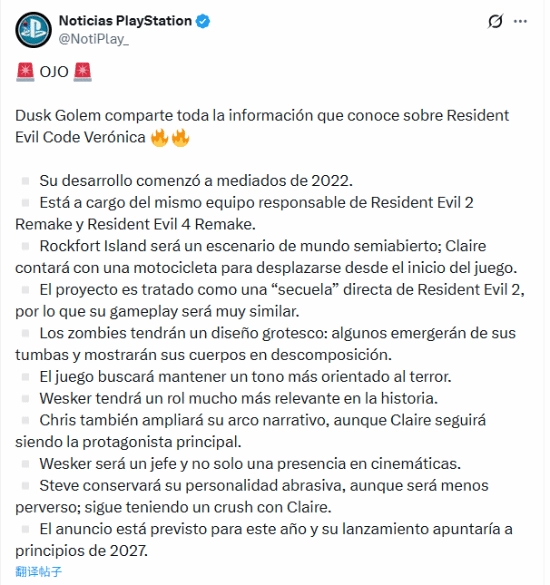 根据知名《生化危机》系列爆料人Dusk Golem的分享内容,再经其他用户整理汇总,现将《生化危机:代号维罗妮卡》重制版的相关情报集合如下: