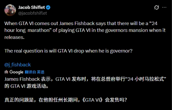 在发表演讲时,菲什巴克表达了自己对GTA系列的喜爱,并明确表示会亲自体验《GTA 6》:“等《GTA 6》正式推出,我们要在州长官邸举办一场24小时的《GTA 6》直播马拉松活动!我们公立学校里的每一位优秀学生都会被邀请过来,一起玩《GTA 6》。”