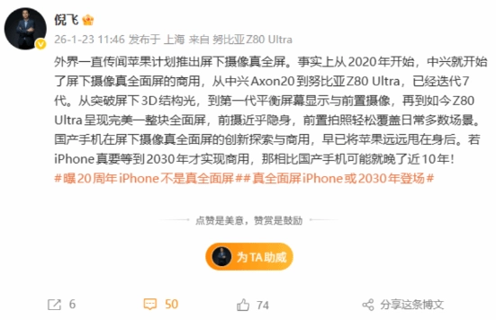针对此事,中兴通讯终端事业部总裁兼努比亚技术有限公司总裁倪飞发布消息回应表示,外界长期有传闻称苹果拟推出配备屏下摄像技术的真全面屏产品,然而实际上,中兴在2020年就已经完成了该技术的商业化应用。