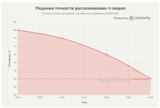 图表显示:标题为“AI视频识别准确率呈下降趋势”,从2019年到2025年,随着时间推移,人们分辨AI视频时越来越依赖猜测。
