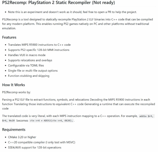有一个名为PS2Recomp的项目,由巴西开发者所打造。该项目运用静态重新编译技术,将PS2的二进制文件转化为C++代码。通过这种方式,PS2游戏便能够制作出PC原生版本,直接在电脑上运行。