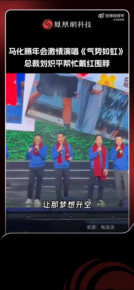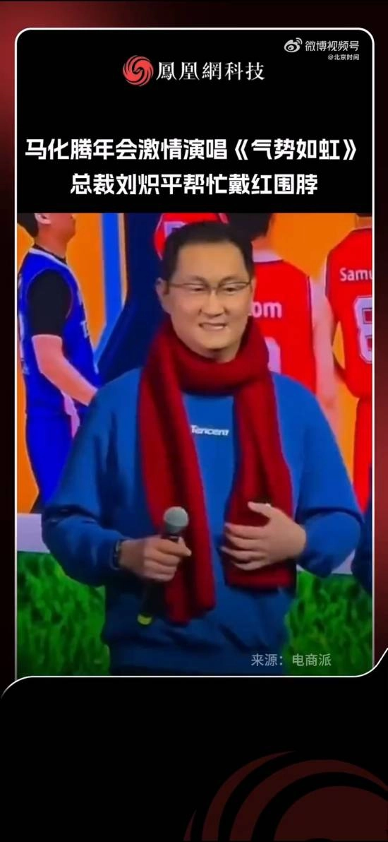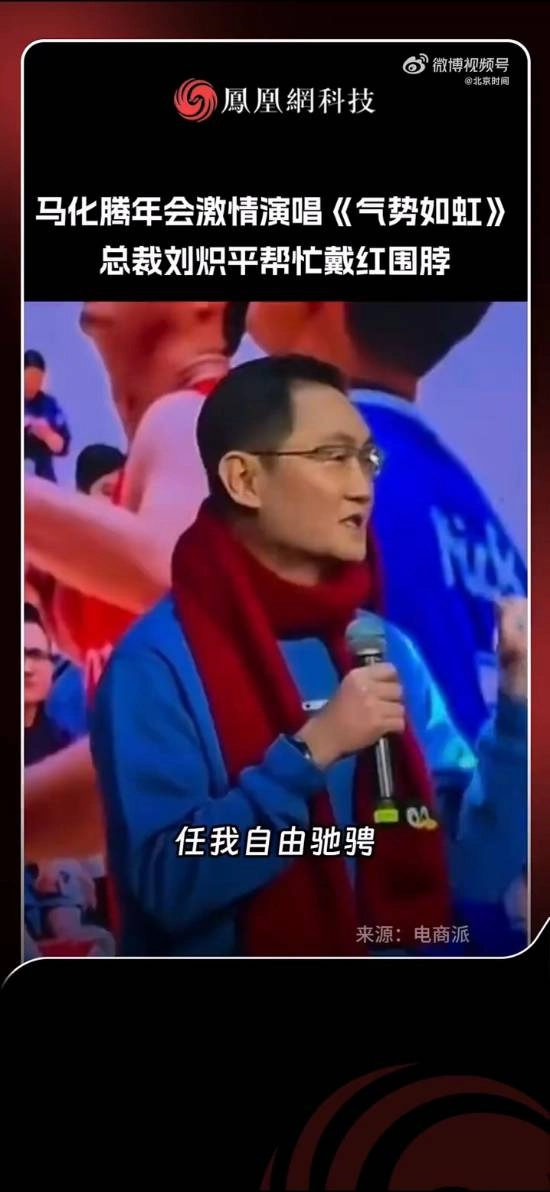 腾讯董事局主席马化腾带领高管团队一同出席活动,所有人都围着带有经典企鹅标志的红色围巾。在活动现场,马化腾充满激情地演唱了《气势如虹》,总裁刘炽平还上前帮他整理围巾。