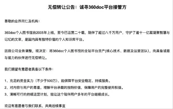 360doc个人图书馆于1月24日发布公告称,由于公司业务调整,决定将全站平台资产(涵盖核心技术、数据及运营团队)无偿转让给有诚意且具备相应能力的合作方。公告同时明确了团队对意向方的期望条件,具体包括:拥有不低于500万的充足资金实力、秉持尊重内容与用户的理念,以及具备清晰可行的持续运营规划。
