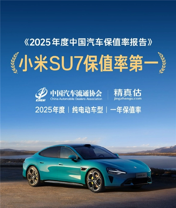 1月28日消息,近日由中国汽车流通协会与精真估联合发布的《2025年度中国汽车保值率报告》指出,小米SU7在纯电车型一年保值率排名中位居榜首,保值率达86.05。