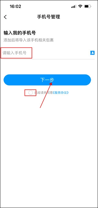 进入手机号管理界面,填写要添加的亲友手机号码,勾选同意相关协议,接着点击“下一步”,然后输入收到的验证码,这样就能完成添加了。