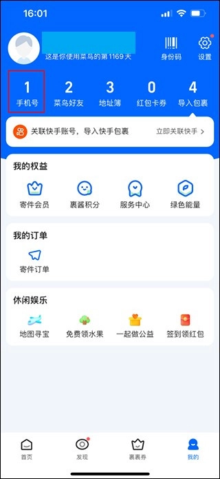 打开菜鸟应用程序,进入用户界面后,点击页面右下角的“我的”按钮。