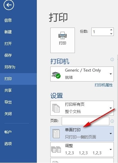 4、进入打印设置界面后,找到单面打印的选项,点击开启此选项,完成打印设置的调整。