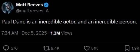 执导了由达诺饰演“谜语人”的《新蝙蝠侠》的导演马特·里夫斯,近日更新推文称:“保罗·达诺不仅是一位极为出色的演员,同时也是个非常好的人。”