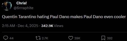 两个月前,昆汀曾在播客节目里公开指责保罗·达诺是演员工会中最差劲的演员。近日,保罗·达诺对此事做出了回应,表示十分感谢全球各地为他发声的人们。