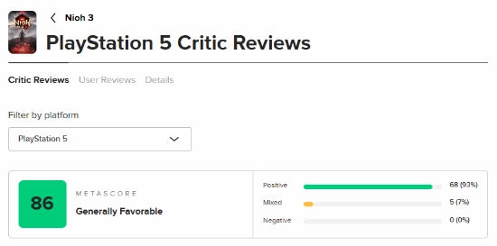 光荣与忍者组联合开发的《仁王3》媒体评分已陆续公布!在MetaCritic网站上,该作PC平台的媒体综合评分为84分,PS5平台则为86分,稍高于PC平台。