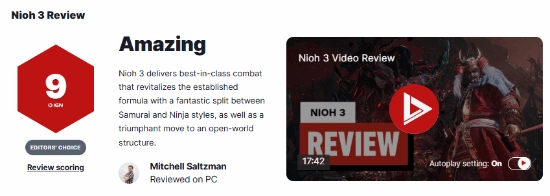 IGN和GameSpot同样给这款作品打出了9分的高分。IGN评价道,本作的“战斗体验堪称一流,两种战斗风格有着精彩的区分度,同时在开放世界模式的探索上迈出了重要一步”;而GameSpot则认为,“游戏体验经过了优化提升,核心的动作系统也融入了全新内容,在各个层面都达到了近乎完美的水准”。