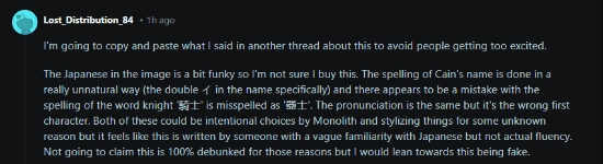 不过,海外玩家大多对这个爆料的真实性抱持怀疑态度。有玩家提出,爆料图里的日语表达有很明显的漏洞:像男主角名字的拼写显得很生硬,而且“騎士”还被误写成了发音相同但意思不对的“器士”。从整体的行文风格能看出,作者虽然对日语有一些了解,但还没到熟练运用的程度,更像是非母语人士或者机器生成的内容。