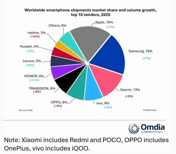 2月5日消息,根据Omdia的数据,荣耀手机2025年的全球出货量增幅达到11%,是全球前十大手机厂商中增长速度最快的品牌。
