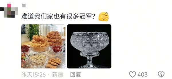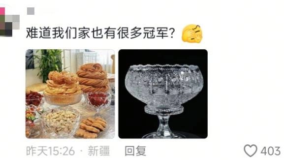 有意思的是,评论区被不少新疆网友“攻占”了,大家都留言说“这个奖杯看着很眼熟”,还晒出自己家里的果盘来做对比。