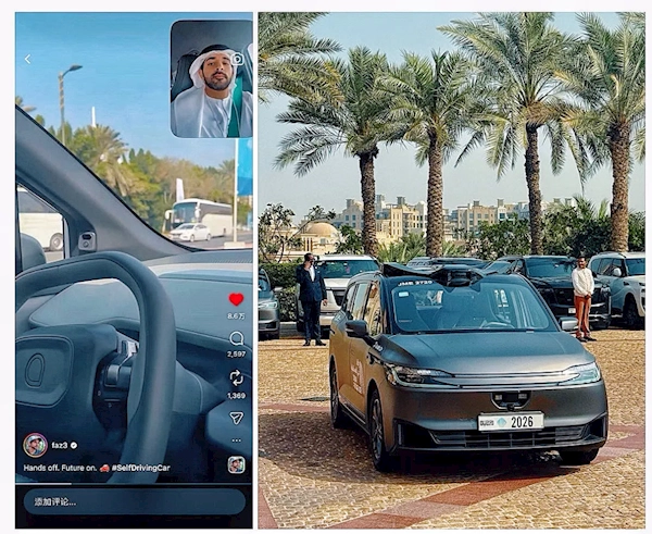 他搭乘车牌号为DUBAI 2026的无人驾驶车辆前往会场。体验完毕后,他在社交平台发布动态感慨道:“Hands off. Future on.(解放双手、未来已来!)”